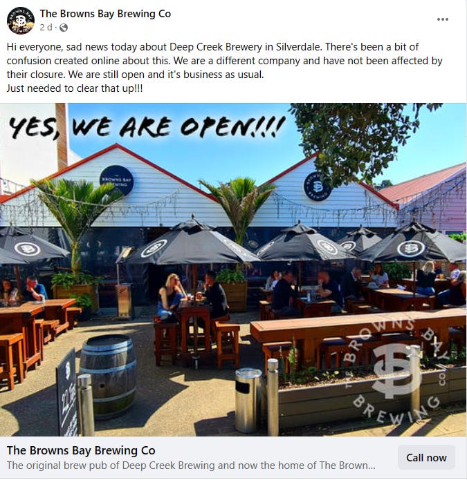What price did Deep Creek pay, in the long run, for selling off the Browns Bay bar where it all started? The Browns Bay Brewing Co, which now brews on that site, has been at pains this week to point out that they are going OK thanks, keep coming.
