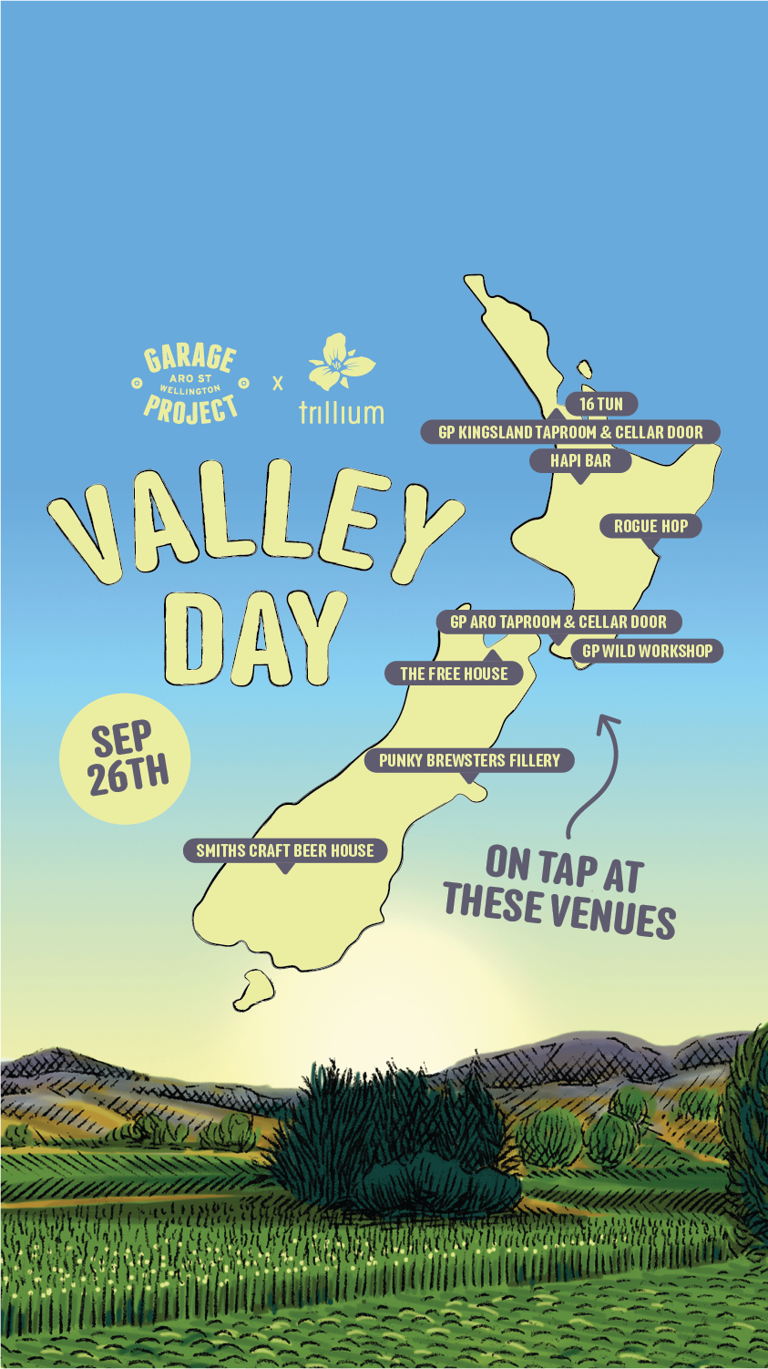Nokomai Valley will feature Garston-grown Motueka, New Zealand Cascade and Nelson Sauvin which Pete Gillespie from Garage Project says “creates an intensely juicy burst of passionfruit and guava, an ironically tropical twist given the latitude of the farm”.