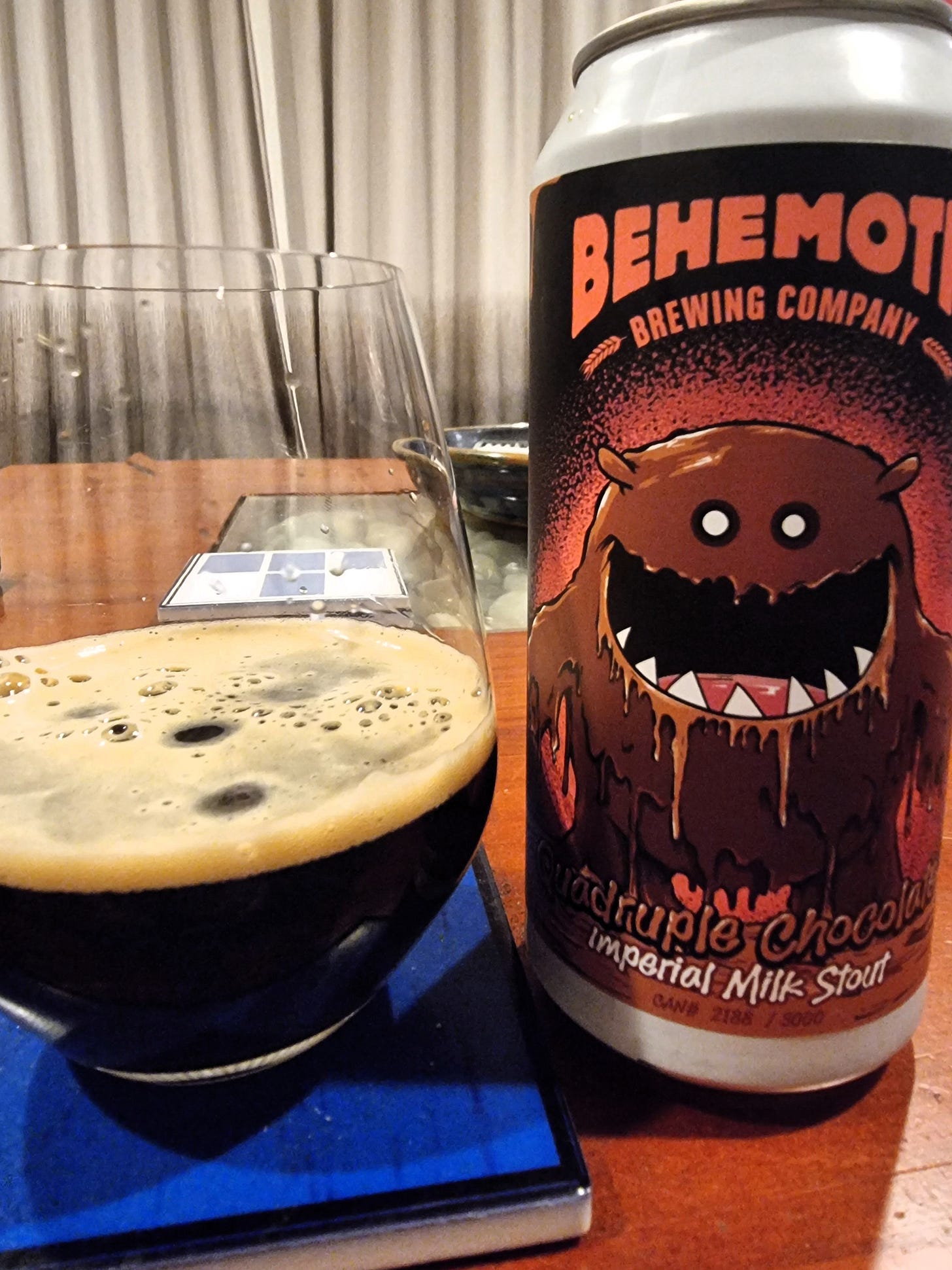 I've always been a big fan of Behemoth's Triple Chocolate Milk Stout, so how could I say no to a Quadruple version?! Despite the implication of the name (and the awesome can art), this isn't such an insane over-the-top experience as you might expect. It significantly ramps up the chocolatey-ness of the beer, but I don't think it loses fundamental beery-ness of the original. It's definitely a dessert beer, but it doesn't reach into pastry stout territory, in my opinion. Big, sweet, chocolate nose, lashings of milk chocolate on the palate and a hint of drying roastiness on the finish. A beer for sipping, not quaffing, but more approachable than you might expect. — Martin Bridges